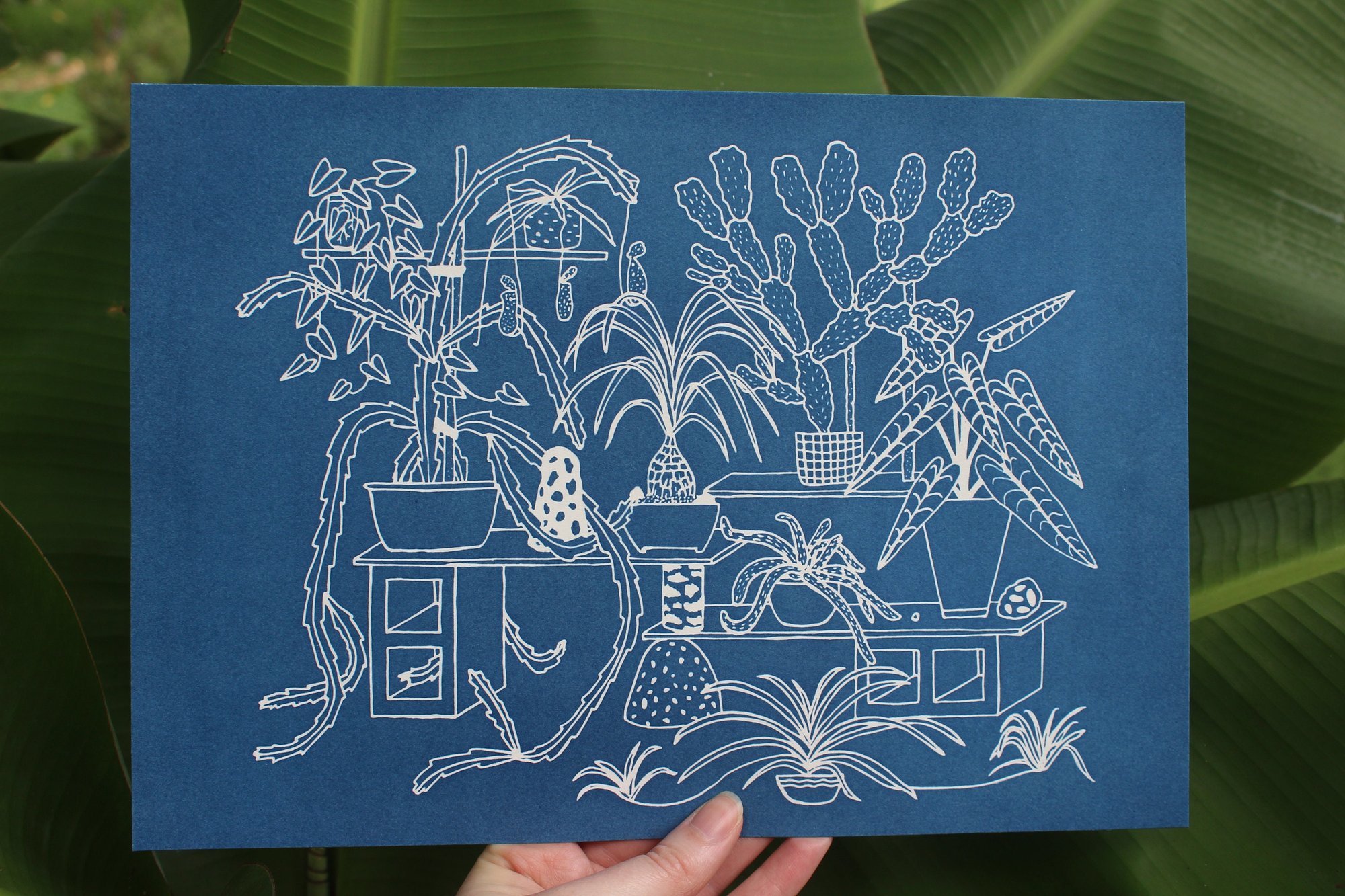My cyanotypes are created by coating paper with a light-sensitive solution, placing a stencil, plant, or a hand-drawn negative onto the paper, and exposing the paper to sunlight. The image is then developed in water and hung up to dry. The resulting print is a beautiful prussian blue colour. Cyanotypes are also known as sun prints or blue prints. Every cyanotype is one of a kind and results are unique with each exposure depending on the weather, exposure time, and the coating of the light-sensitive solution. This means there’s a slight variation in the depth of blue between each artwork.